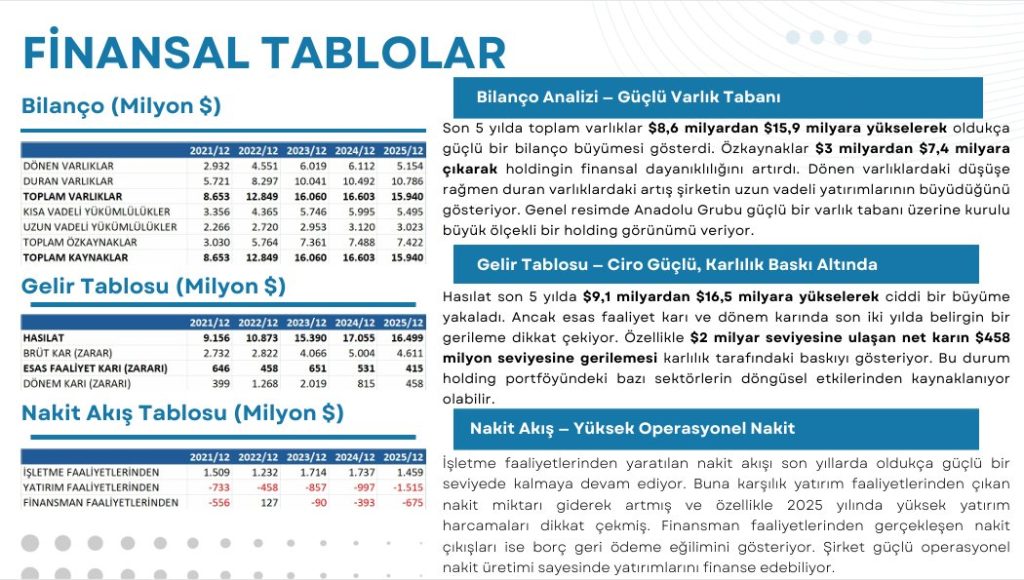 Anadolu Grubu Holding güçlü varlık yapısı, geniş sektör çeşitliliği ve yüksek operasyonel nakit üretimi ile finansal açıdan sağlam bir holding profili çiziyor.