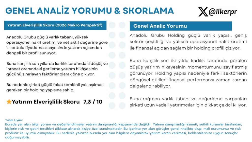 7.3 / 10 Anadolu Grubu güçlü varlık tabanı, yüksek operasyonel nakit üretimi ve net aktif değerine göre iskontolu fiyatlaması sayesinde yatırım açısından dengeli bir profil sunuyor. Buna karşılık son yıllarda karlılık tarafındaki düşüş ve ihracat oranındaki gerileme yatırım hikâyesinin gücünü sınırlayan faktörler olarak öne çıkıyor. Bu nedenle şirket güçlü fakat temkinli yaklaşılması gereken bir holding yapısına sahip.