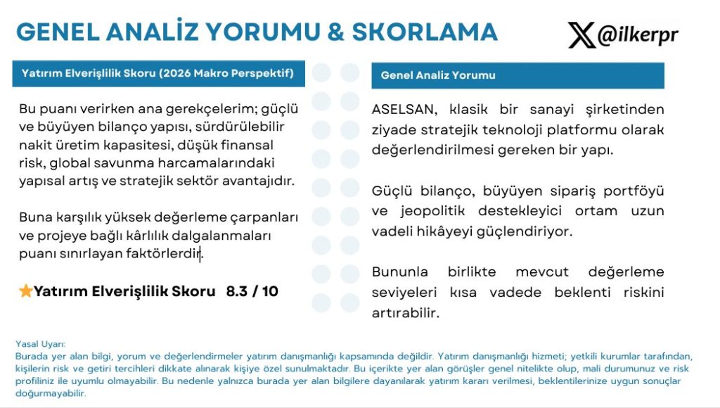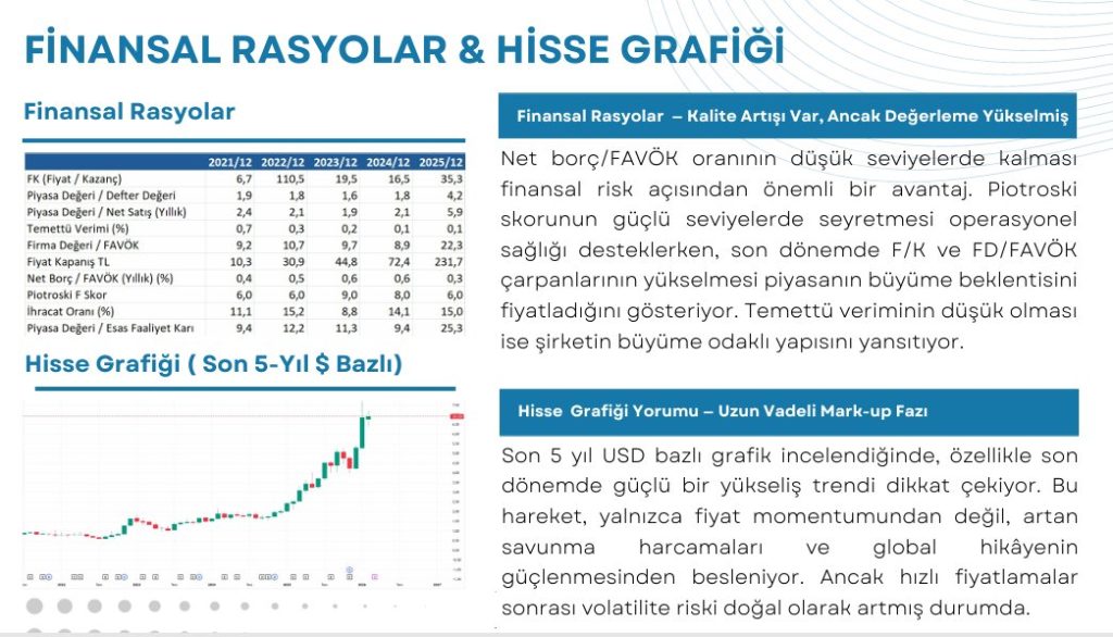 8.3 / 10 Bu puanı verirken ana gerekçelerim; güçlü ve büyüyen bilanço yapısı, sürdürülebilir nakit üretim kapasitesi, düşük finansal risk, global savunma harcamalarındaki yapısal artış ve stratejik sektör avantajıdır. Buna karşılık yüksek değerleme çarpanları ve projeye bağlı karlılık dalgalanmaları puanı sınırlayan faktörlerdir.