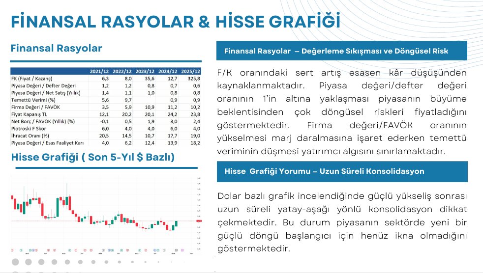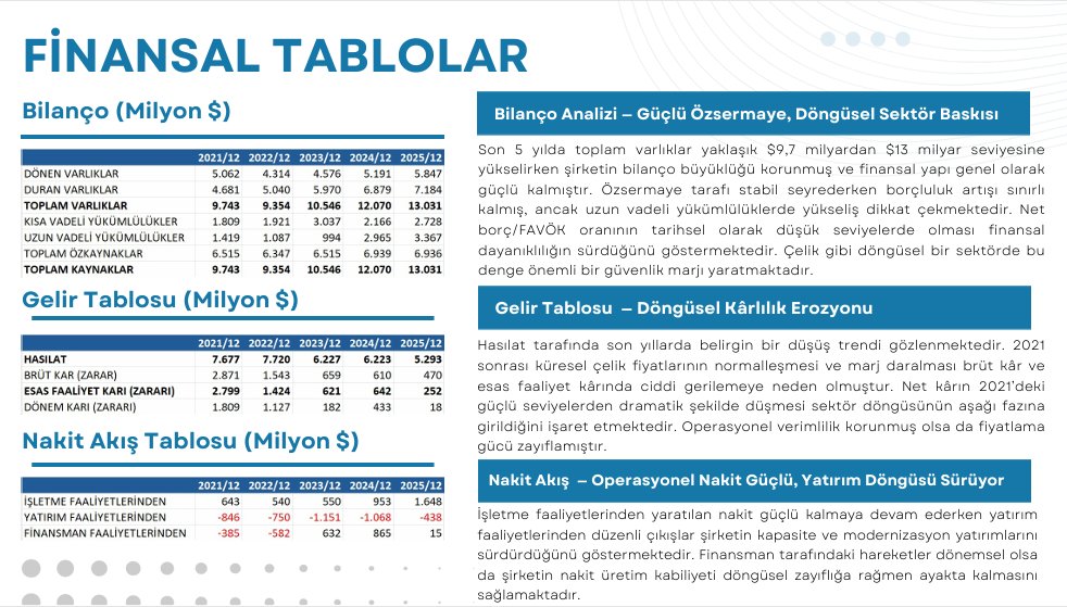 6.8 / 10 Bu puanı verirken, Şirketin güçlü özsermaye yapısı, düşük borçluluk seviyesi ve düzenli nakit üretimi önemli bir güvenlik marjı sağlamaktadır. Bununla birlikte çelik sektörünün doğası gereği yüksek döngüsellik ve küresel emtia fiyatlarına bağımlılık yatırım görünümünü sınırlamaktadır. Karlılık trendinin zayıflaması değerleme çarpanlarını bozarken piyasa tarafından “bekle-gör” modunda fiyatlandığı görülmektedir. Yeni bir yatırım hikayesi için global talep artışı, marj genişlemesi ve çelik fiyatlarında sürdürülebilir toparlanma belirleyici olacaktır.