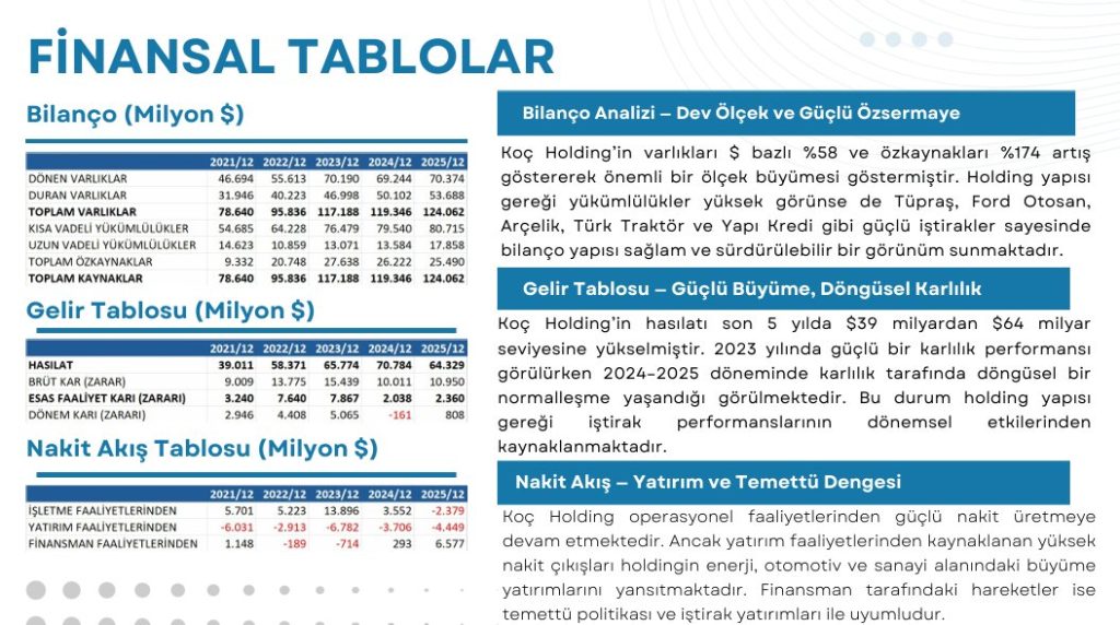 Koç Holding Bilanço Analizi Koç Holding’in varlıkları $ bazlı %58 ve özkaynakları %174 artış göstererek önemli bir ölçek büyümesi göstermiştir. Holding yapısı gereği yükümlülükler yüksek görünse de Tüpraş, Ford Otosan, Arçelik, Türk Traktör ve Yapı Kredi gibi güçlü iştirakler sayesinde bilanço yapısı sağlam ve sürdürülebilir bir görünüm sunmaktadır.