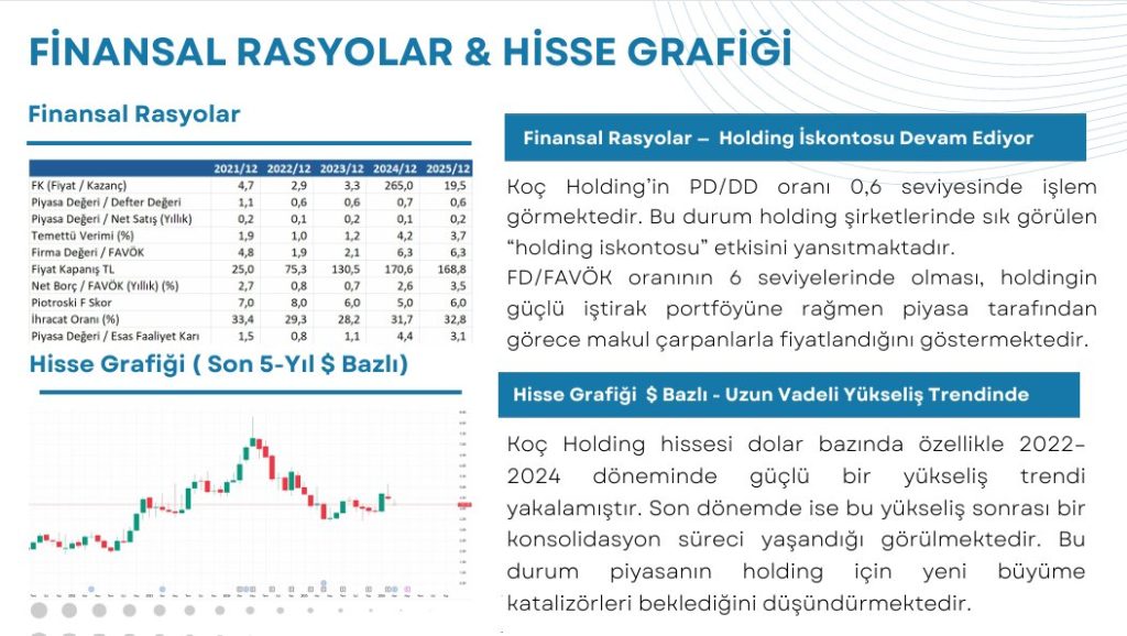 Koç Holding Finansal Rasyolar Analizi Koç Holding’in PD/DD oranı 0,6 seviyesinde işlem görmektedir. Bu durum holding şirketlerinde sık görülen “holding iskontosu” etkisini yansıtmaktadır. FD/FAVÖK oranının 6 seviyelerinde olması, holdingin güçlü iştirak portföyüne rağmen piyasa tarafından görece makul çarpanlarla fiyatlandığını göstermektedir.