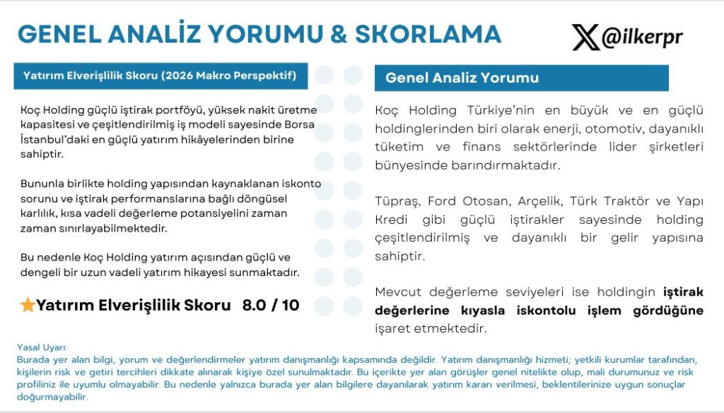 8.0 / 10 Koç Holding güçlü iştirak portföyü, yüksek nakit üretme kapasitesi ve çeşitlendirilmiş iş modeli sayesinde Borsa İstanbul’daki en güçlü yatırım hikâyelerinden birine sahiptir. Bununla birlikte holding yapısından kaynaklanan iskonto sorunu ve iştirak performanslarına bağlı döngüsel karlılık, kısa vadeli değerleme potansiyelini zaman zaman sınırlayabilmektedir. Bu nedenle Koç Holding yatırım açısından güçlü ve dengeli bir uzun vadeli yatırım hikayesi sunmaktadır.