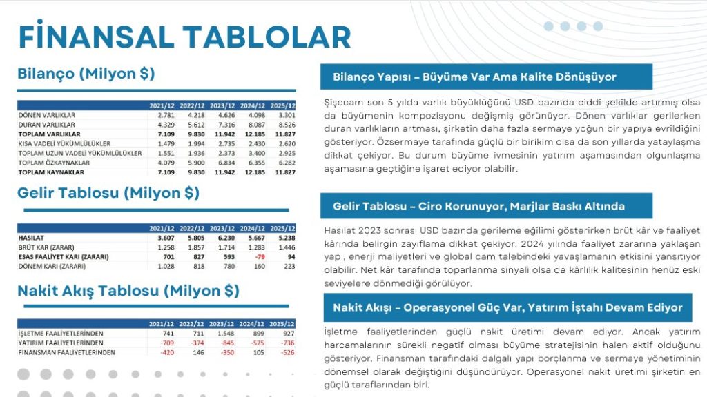 Şişecam Bilanço Analizi Şişecam son 5 yılda varlık büyüklüğünü $ bazında ciddi şekilde artırmış olsa da büyümenin kompozisyonu değişmiş görünüyor. Dönen varlıklar gerilerken duran varlıkların artması, şirketin daha fazla sermaye yoğun bir yapıya evrildiğini gösteriyor. Özsermaye tarafında güçlü bir birikim olsa da son yıllarda yataylaşma dikkat çekiyor. Bu durum büyüme ivmesinin yatırım aşamasından olgunlaşma aşamasına geçtiğine işaret ediyor olabilir.
