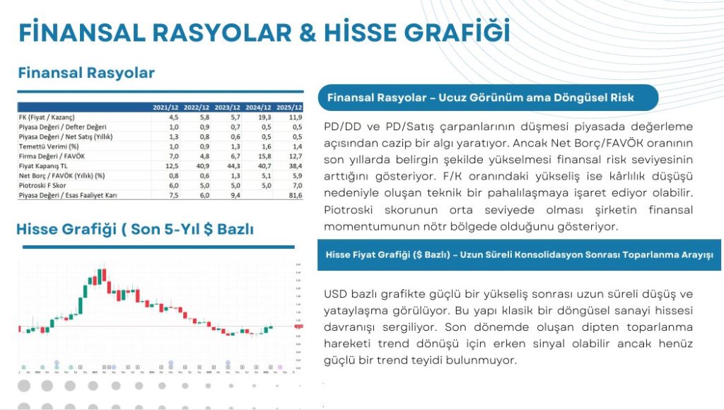 Operasyonel nakit üretimi güçlü olsa da artan borçluluk ve global talep döngüsü hisse performansını belirleyen ana faktörler olmaya devam ediyor. Döngüsel sektör doğası nedeniyle toparlanma potansiyeli mevcut ancak güçlü trend için marj iyileşmesi kritik.