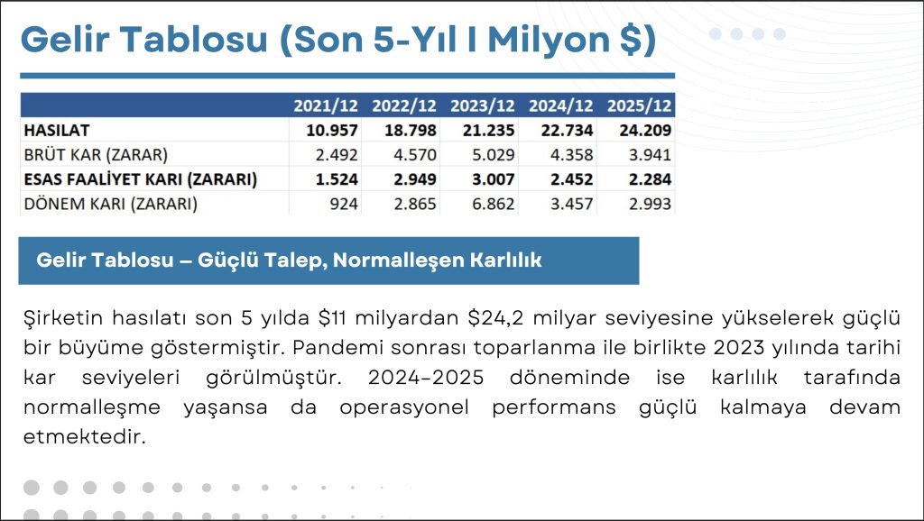 Ayrıca gelirlerin yaklaşık %88–90’ının döviz bazlı olması, şirketi kur riskine karşı doğal olarak