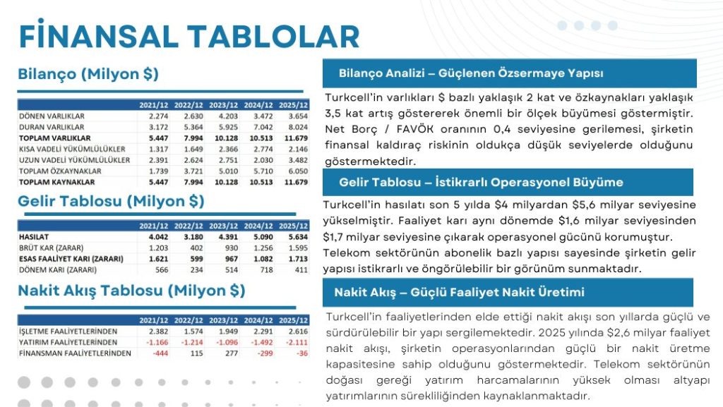 Turkcell güçlü nakit üretme kapasitesi, düşük borçluluk seviyesi ve istikrarlı gelir modeli ile Türkiye’nin en güçlü telekom şirketlerinden biri konumundadır.