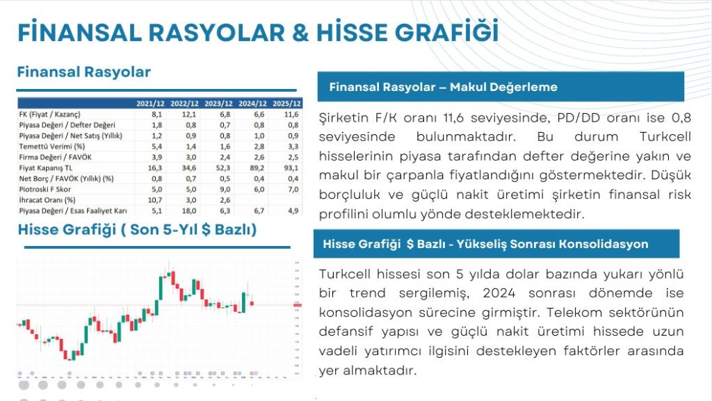 Turkcell Finansal Rasyolar Analizi Şirketin F/K oranı 11,6 seviyesinde, PD/DD oranı ise 0,8 seviyesinde bulunmaktadır. Bu durum Turkcell hisselerinin piyasa tarafından defter değerine yakın ve makul bir çarpanla fiyatlandığını göstermektedir. Düşük borçluluk ve güçlü nakit üretimi şirketin finansal risk profilini olumlu yönde desteklemektedir.