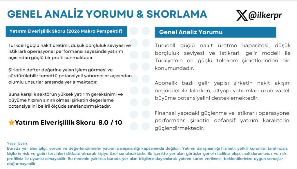 8.0 / 10 Turkcell güçlü nakit üretimi, düşük borçluluk seviyesi ve istikrarlı operasyonel performansı sayesinde yatırım açısından güçlü bir profil sunmaktadır. Şirketin defter değerine yakın işlem görmesi ve sürdürülebilir temettü potansiyeli yatırımcılar açısından olumlu unsurlar arasında yer almaktadır. Buna karşılık sektörün yüksek yatırım gereksinimi ve büyüme hızının sınırlı olması şirketin değerleme potansiyelini belirli ölçüde sınırlandırmaktadır.