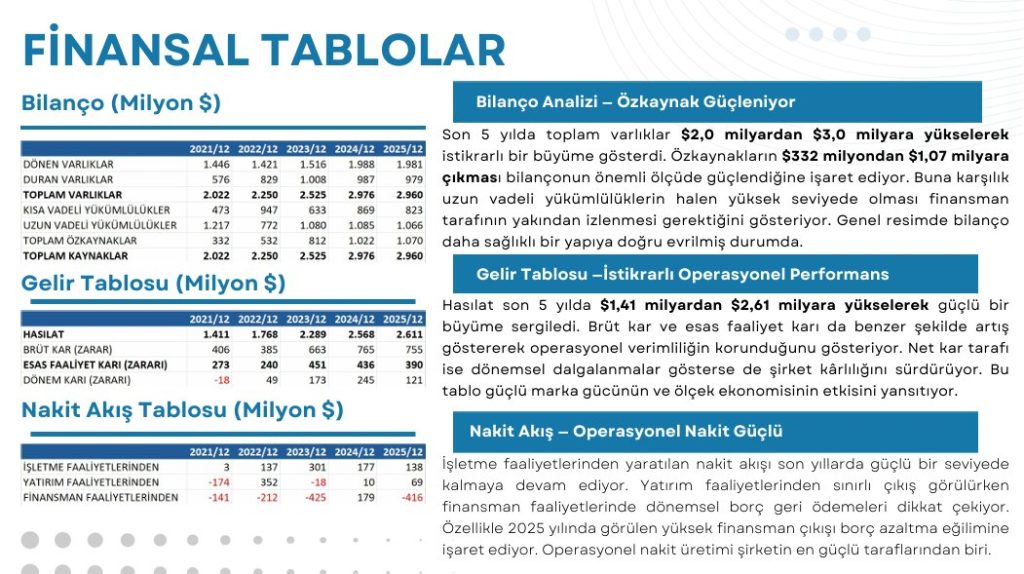 ÜLKER Bilanço Analizi Son 5 yılda toplam varlıklar $2,0 milyardan $3,0 milyara yükselerek istikrarlı bir büyüme gösterdi. Özkaynakların $332 milyondan $1,07 milyara çıkması bilançonun önemli ölçüde güçlendiğine işaret ediyor. Buna karşılık uzun vadeli yükümlülüklerin halen yüksek seviyede olması finansman tarafının yakından izlenmesi gerektiğini gösteriyor. Genel resimde bilanço daha sağlıklı bir yapıya doğru evrilmiş durumda.