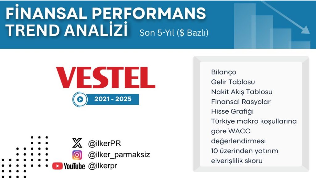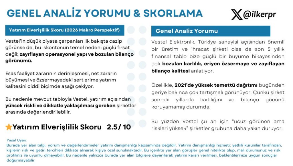 2.5 / 10 Vestel’in düşük piyasa çarpanları ilk bakışta cazip görünse de, bu iskontonun temel nedeni güçlü fırsat değil; zayıflayan operasyonel yapı ve bozulan bilanço görünümü. Esas faaliyet zararının derinleşmesi, net zararın büyümesi ve özsermayedeki sert erime yatırım kalitesini ciddi biçimde aşağı çekiyor. Bu nedenle mevcut tabloyla Vestel, yatırım açısından yüksek riskli ve dikkatle yaklaşılması gereken şirketler arasında değerlendirilebilir. Yasal Uyarı: Burada yer alan bilgi, yorum ve değerlendirmeler yatırım danışmanlığı kapsamında değildir. Yatırım danışmanlığı hizmeti; yetkili kurumlar tarafından, kişilerin risk ve getiri tercihleri dikkate alınarak kişiye özel sunulmaktadır. Bu içerikte yer alan görüşler genel nitelikte olup, mali durumunuz ve risk profiliniz ile uyumlu olmayabilir. Bu nedenle yalnızca burada yer alan bilgilere dayanılarak yatırım kararı verilmesi, beklentilerinize uygun sonuçlar doğurmayabilir.