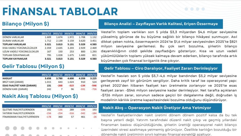 VESTEL Gelir Tablosu Analizi Vestel’in hasılatı son 5 yılda $3,7–4,6 milyar bandından $3,2 milyar seviyesine gerileyerek zayıf bir görünüm sergiliyor. Daha kritik taraf ise operasyonel yapı: şirket 2022’den itibaren faaliyet karı üretmekte zorlanıyor ve 2025’te esas faaliyet zararı -$546 milyon seviyesine kadar derinleşiyor. Net tarafta açıklanan -$726 milyon zarar, sorunun sadece geçici bir dalgalanma değil, doğrudan iş modelinin kArlılık üretme kapasitesindeki bozulma olduğunu düşündürüyor.