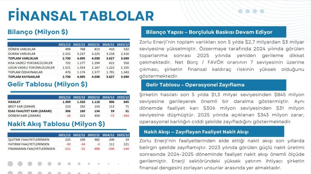 Zorlu Enerji Bilanço Analizi Zorlu Enerji’nin toplam varlıkları son 5 yılda $2,7 milyardan $3 milyar seviyesine yükselmiştir. Özsermaye tarafında 2024 yılında görülen toparlanma sonrası 2025 yılında yeniden gerileme dikkat çekmektedir. Net Borç / FAVÖK oranının 7 seviyesinin üzerine çıkması, şirketin finansal kaldıraç riskinin yüksek olduğunu göstermektedir.