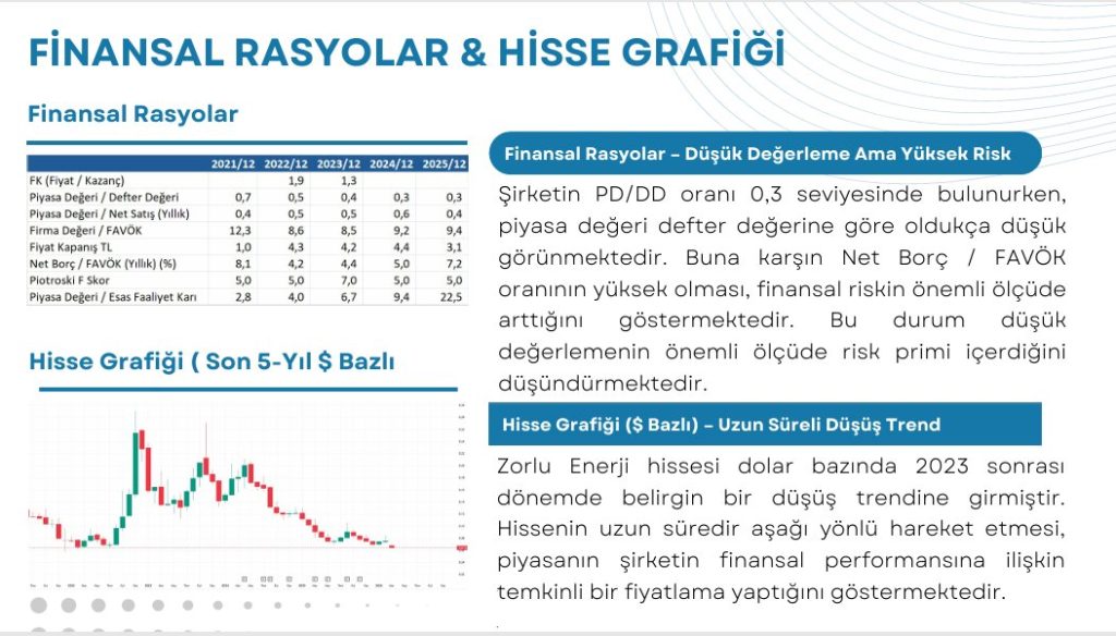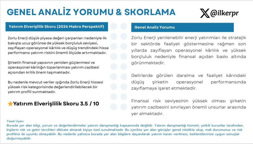 3.5 / 10 Zorlu Enerji düşük piyasa değeri çarpanları nedeniyle ilk bakışta ucuz görünse de yüksek borçluluk seviyesi, zayıflayan operasyonel kârlılık ve düşüş trendindeki hisse performansı yatırım riskini önemli ölçüde artırmaktadır. Şirketin finansal yapısının yeniden güçlenmesi ve operasyonel karlılığın toparlanması yatırım cazibesi açısından kritik önem taşımaktadır. Bu nedenle mevcut veriler ışığında Zorlu Enerji hissesi yüksek risk kategorisinde değerlendirilebilecek bir yatırım profili sunmaktadır.